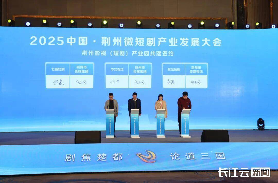 荆州影视(短剧)产业园共建签约,中文在线、七猫短剧、咪咕短剧三大短剧头部平台代表,与荆州市传媒集团签订共建协议。